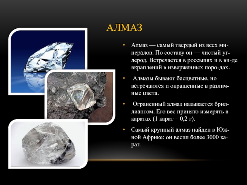 Алмаз — самый твердый из всех ми-нералов. По составу он —