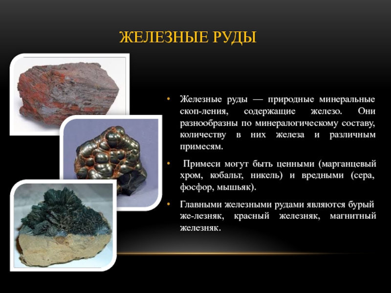 Железные руды — природные минеральные скоп-ления, содержащие железо. Они
