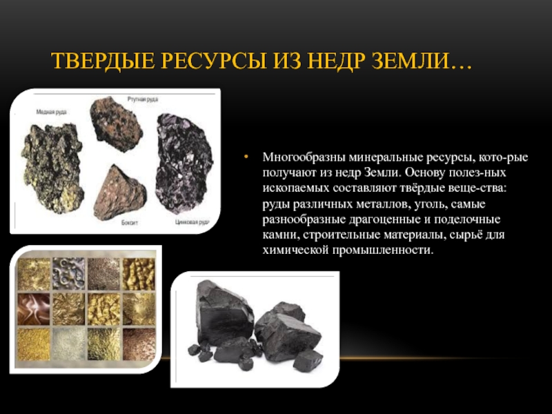 Земли. Основу полез-ных ископаемых составляют твёрдые веще-ства: руды различных металлов, уголь, самые разнообразные драгоценные и поделочные камни, строительные материалы, сырьё для химической промышленности.