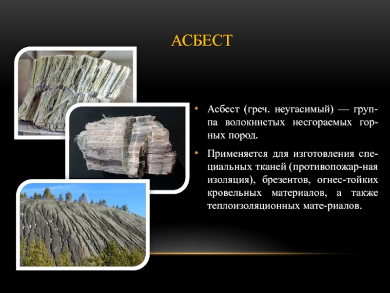 Асбест (греч. неугасимый) — груп-па волокнистых несгораемых гор-ных пород.