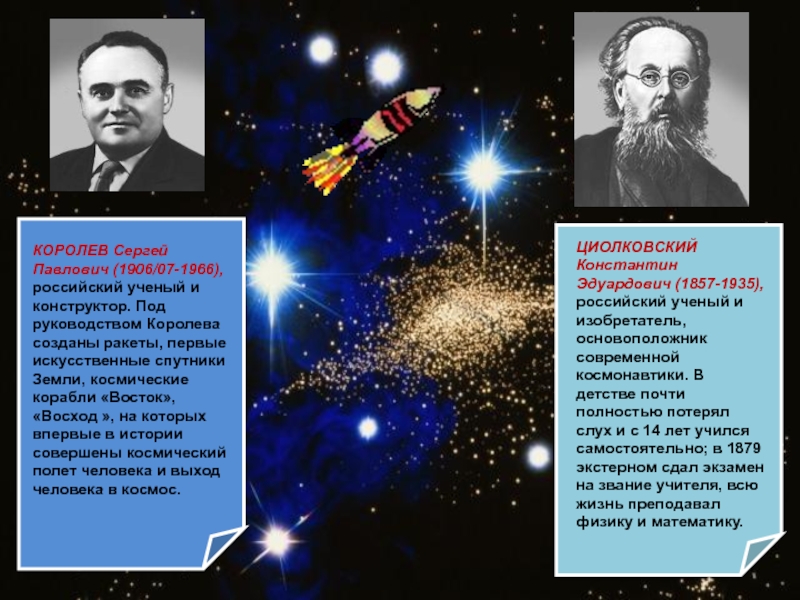 КОРОЛЕВ Сергей Павлович (1906/07-1966), российский ученый и конструктор. Под руководством Королева созданы ракеты, первые искусственные спутники Земли, космические корабли «Восток», «Восход », на которых впервые в истории совершены космический полет человека и выход человека в космос.