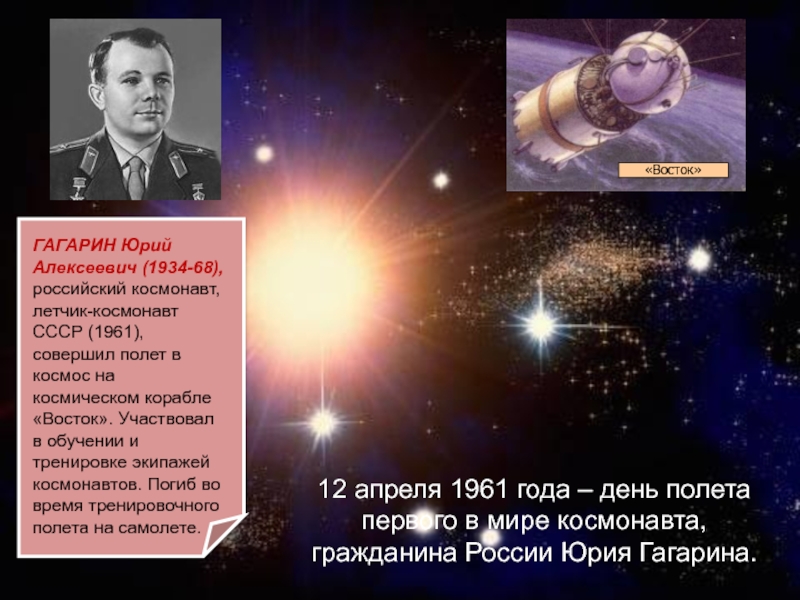 ГАГАРИН Юрий Алексеевич (1934-68), российский космонавт, летчик-космонавт СССР (1961), совершил полет в космос на космическом корабле «Восток». Участвовал в обучении и тренировке экипажей космонавтов. Погиб во время тренировочного полета на самолете.
