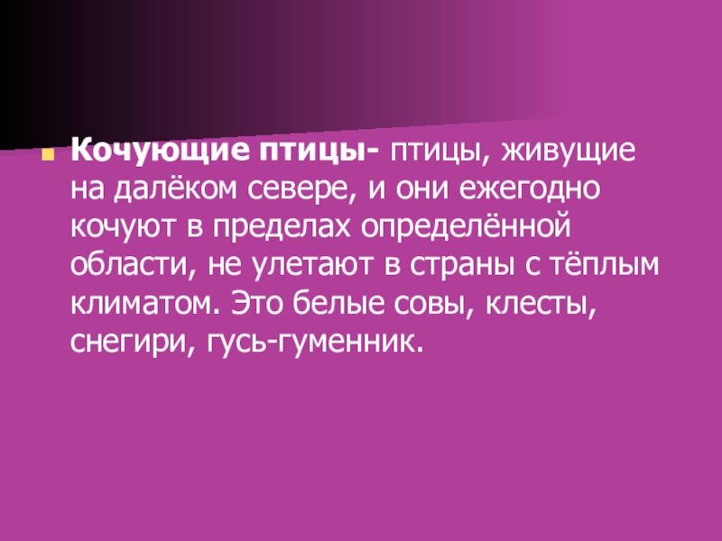 Слайд 7Кочующие птицы- птицы, живущие на далёком севере, и они ежегодно кочуют