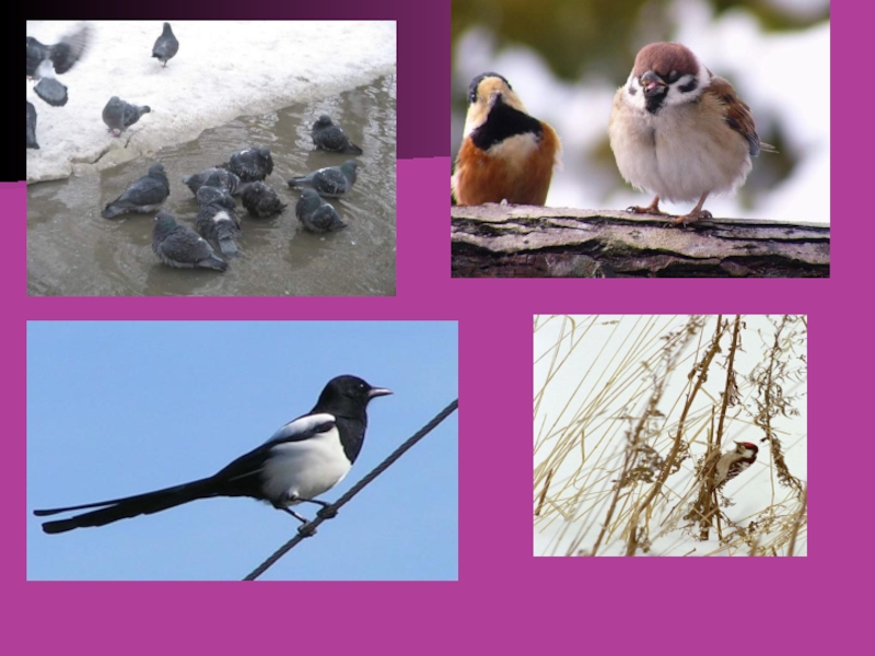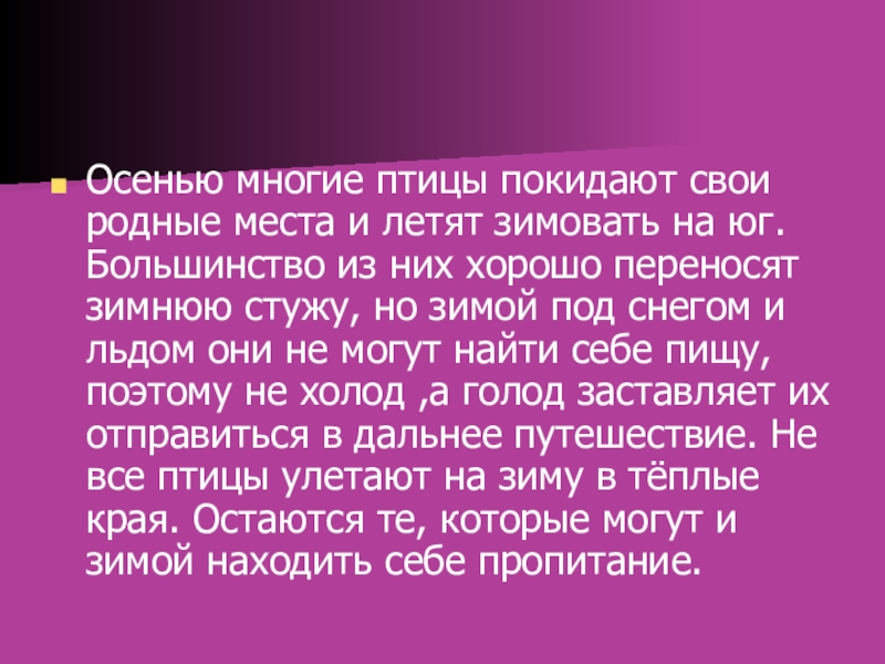 юг. Большинство из них хорошо переносят зимнюю стужу, но зимой под снегом и льдом они не могут найти себе пищу, поэтому не холод ,а голод заставляет их отправиться в дальнее путешествие. Не все птицы улетают на зиму в тёплые края. Остаются те, которые могут и зимой находить себе пропитание.