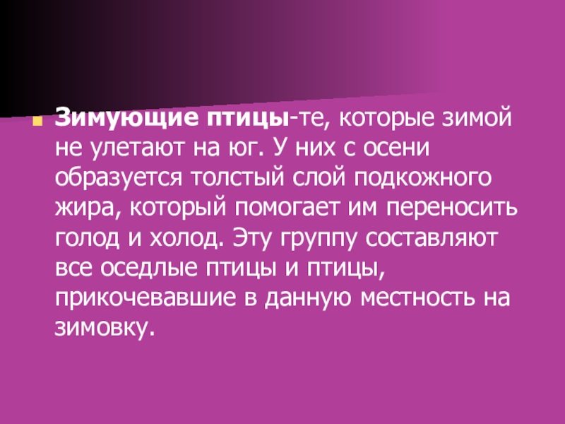 Слайд 4Зимующие птицы-те, которые зимой не улетают на юг. У них с