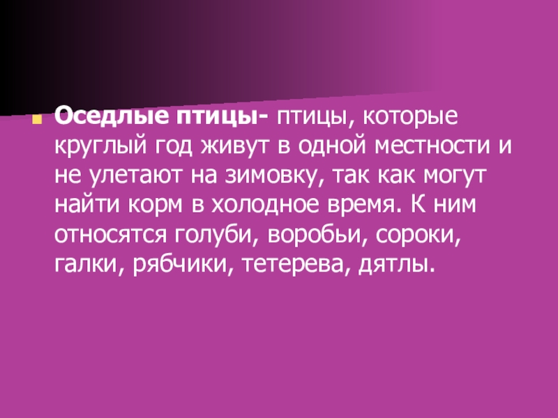 Слайд 9Оседлые птицы- птицы, которые круглый год живут в одной местности и