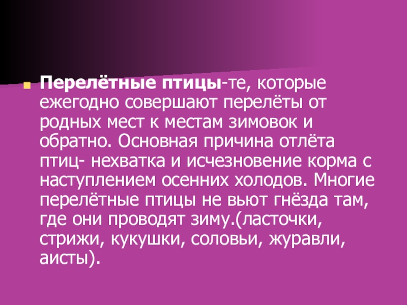 Перелётные птицы-те, которые ежегодно совершают перелёты от родных мест к местам зимовок и обратно. Основная причина отлёта