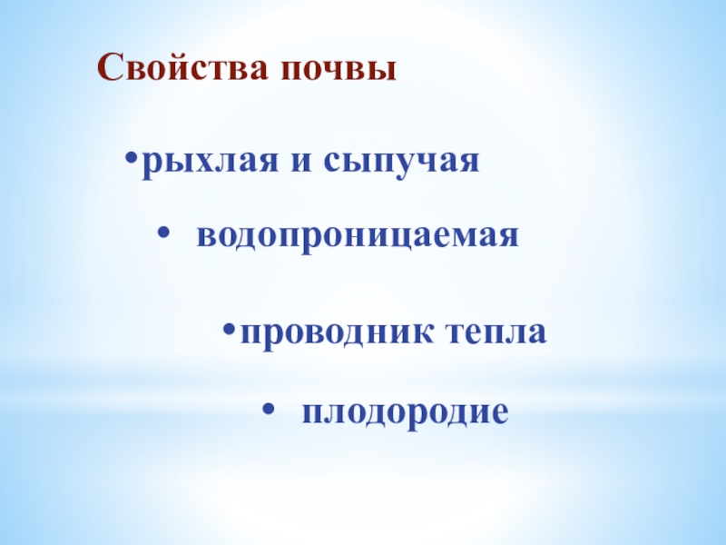 Свойства почвырыхлая и сыпучаяводопроницаемаяпроводник теплаплодородие