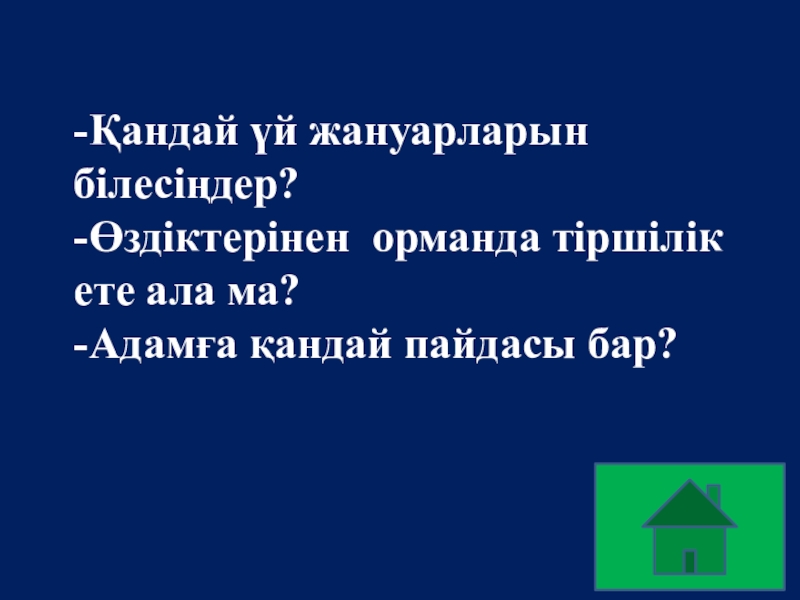 -Қандай үй жануарларын білесіңдер?-Өздіктерінен орманда тіршілік ете ала ма?-Адамға қандай пайдасы бар?
