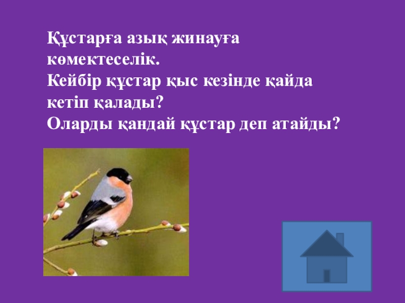 Құстарға азық жинауға көмектеселік.Кейбір құстар қыс кезінде қайда кетіп қалады?Оларды қандай құстар деп атайды?