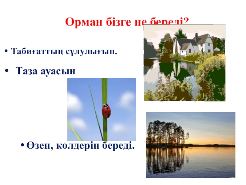 Орман бізге не береді?Табиғаттың сұлулығын.Таза ауасын Өзен, көлдерін береді.