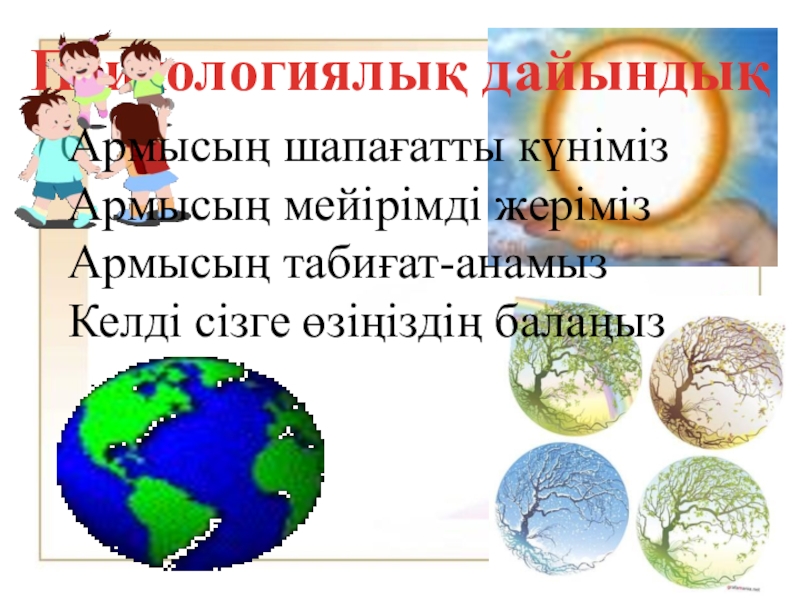 Психологиялық дайындықАрмысың шапағатты күнімізАрмысың мейірімді жерімізАрмысың табиғат-анамызКелді сізге өзіңіздің балаңыз