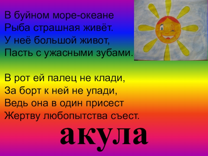 акулаВ буйном море-океане  Рыба страшная живёт.  У неё большой живот,  Пасть с ужасными зубами.