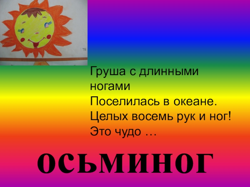 осьминогГруша с длинными ногами  Поселилась в океане.  Целых восемь рук и ног!  Это чудо