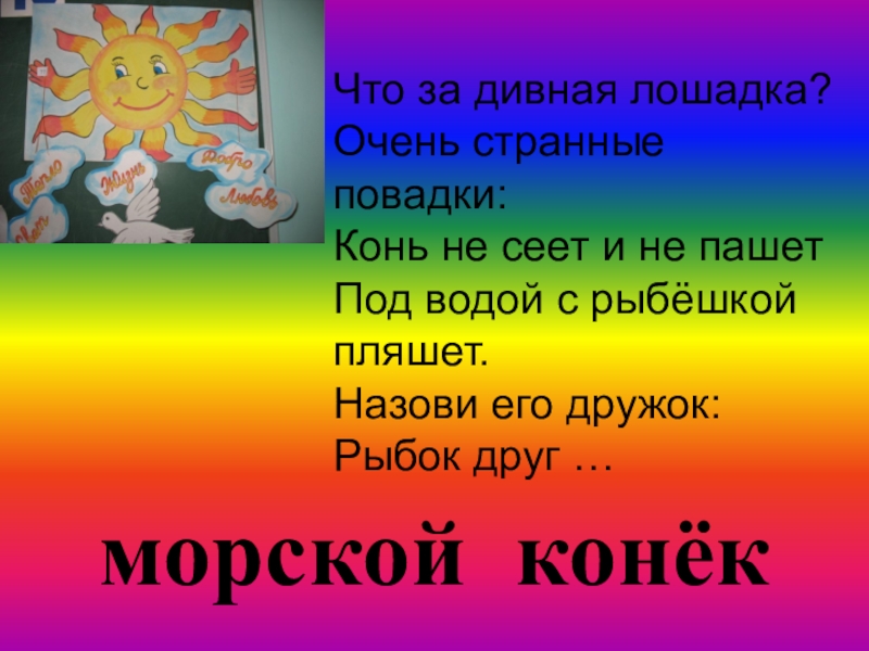 морской конёкЧто за дивная лошадка?  Очень странные повадки:  Конь не сеет и не пашет