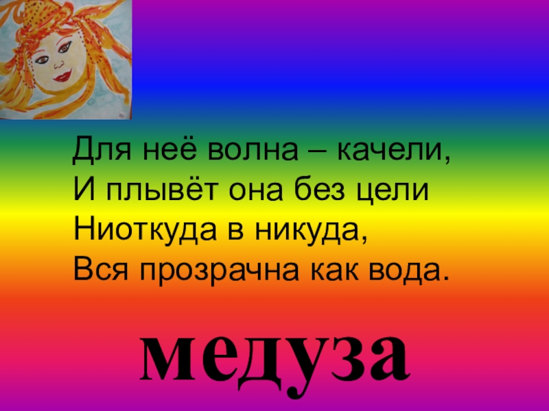 медузаДля неё волна – качели,  И плывёт она без цели  Ниоткуда в никуда,  Вся
