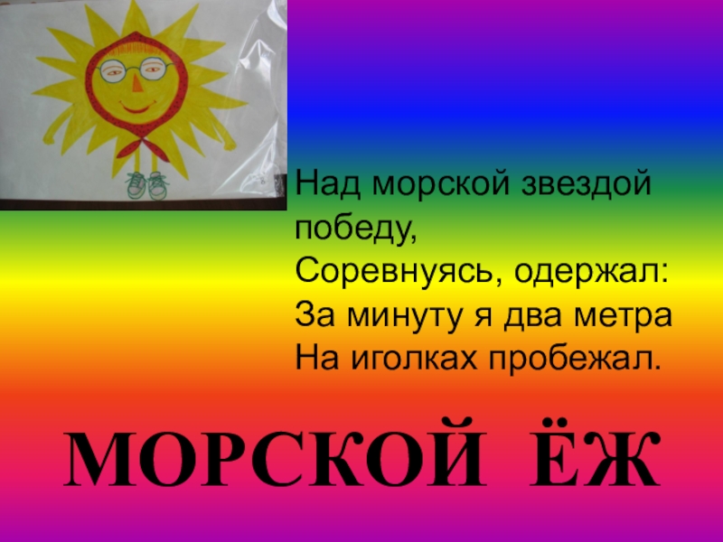 МОРСКОЙ ЁЖНад морской звездой победу,  Соревнуясь, одержал:  За минуту я два метра  На иголках