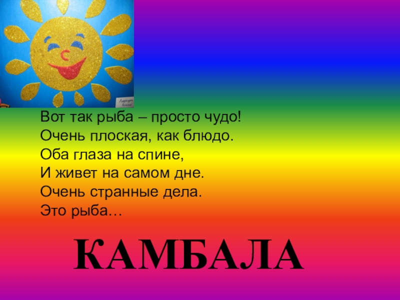 КАМБАЛАВот так рыба – просто чудо!  Очень плоская, как блюдо.  Оба глаза на спине,