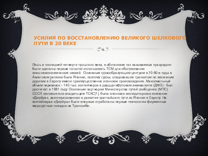 четверти прошлого века, в обстановке так называемых «разрядок» были сделаны первые попытки использовать ТСМ для обслуживания внешнеэкономических связей. Основным грузообразующим центром в 70-80-е годы в Азиатском регионе была Япония, поэтому грузы, следовавшие транзитом по железным дорогам в Европу имели преимущественно японское происхождение. Максимальный объем перевозок – 140 тыс. контейнеров в двадцатифутовом эквиваленте (ДФЭ) - был достигнут в 1981 году. Основным партнером Министерства путей сообщения (МПС) СССР, являвшегося владельцем ТСКС[1], была японская экспедиторская компания «Джуйра», заинтересованная в развитии кратчайшего пути из Японии в Европу. На контейнерах «Джуйры» были впервые отработаны первые технологии фирменных маршрутных поездов на Транссибе.