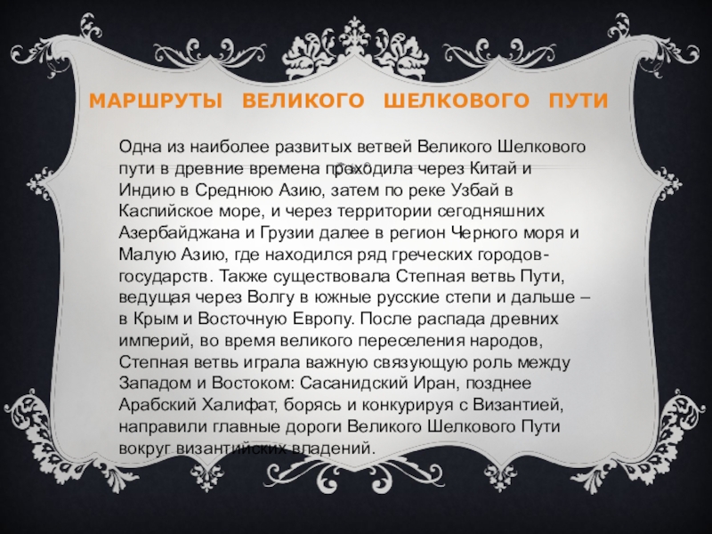 в древние времена проходила через Китай и Индию в Среднюю Азию, затем по реке Узбай в Каспийское море, и через территории сегодняшних Азербайджана и Грузии далее в регион Черного моря и Малую Азию, где находился ряд греческих городов-государств. Также существовала Степная ветвь Пути, ведущая через Волгу в южные русские степи и дальше – в Крым и Восточную Европу. После распада древних империй, во время великого переселения народов, Степная ветвь играла важную связующую роль между Западом и Востоком: Сасанидский Иран, позднее Арабский Халифат, борясь и конкурируя с Византией, направили главные дороги Великого Шелкового Пути вокруг византийских владений.