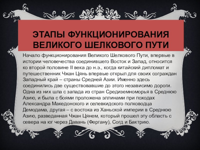 истории человечества соединившего Восток и Запад, относится ко второй половине II века до н.э., когда китайский дипломат и путешественник Чжан Цянь впервые открыл для своих сограждан Западный край – страны Средней Азии. Именно здесь соединились две существовавшие до этого независимо дороги. Одна из них шла с запада из стран Средиземноморья в Среднюю Азию, и была с боями проложена эллинами при походах Александра Македонского и селевкидского полководца Демодама, другая – с востока из Ханьской империи в Среднюю Азию, разведанная Чжан Цянем, который прошел эту область с севера на юг через Давань (Фергану), Согд и Бактрию.