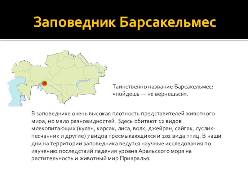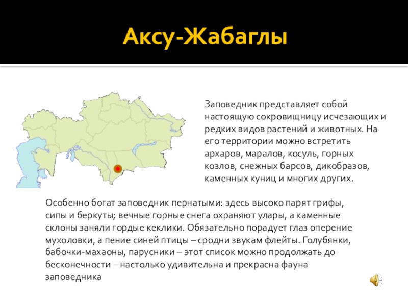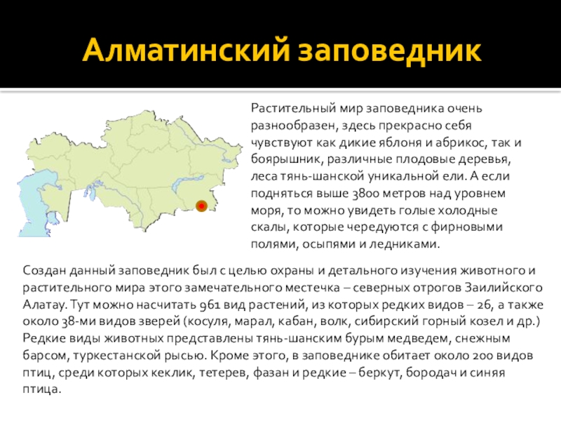 Создан данный заповедник был с целью охраны и детального изучения животного и растительного мира этого замечательного местечка – северных отрогов Заилийского Алатау. Тут можно насчитать 961 вид растений, из которых редких видов – 26, а также около 38-ми видов зверей (косуля, марал, кабан, волк, сибирский горный козел и др.) Редкие виды животных представлены тянь-шанским бурым медведем, снежным барсом, туркестанской рысью. Кроме этого, в заповеднике обитает около 200 видов птиц, среди которых кеклик, тетерев, фазан и редкие – беркут, бородач и синяя птица.