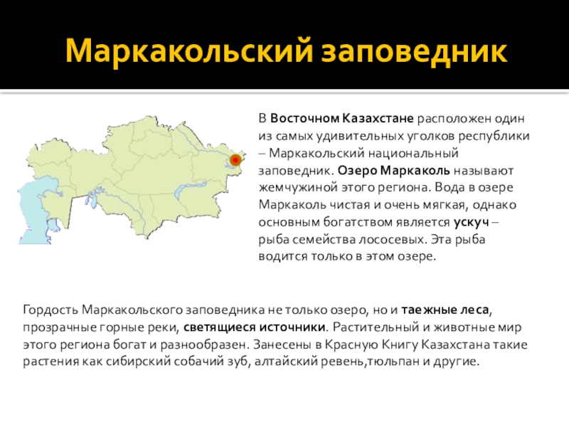 Гордость Маркакольского заповедника не только озеро, но и таежные леса, прозрачные горные реки, светящиеся источники. Растительный и животные мир этого региона богат и разнообразен. Занесены в Красную Книгу Казахстана такие растения как сибирский собачий зуб, алтайский ревень,тюльпан и другие.