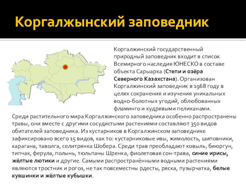 Среди растительного мира Коргалжинского заповедника особенно распространены травы, они вместе с другими сосудистыми растениями составляют 350 видов обитателей заповедника. Из кустарников в Коргалжинском заповеднике зафиксировано всего 15 видов, как то: кустарниковые ивы, жимолость, шиповники, карагана, таволга, селитрянка Шобера. Среди трав преобладают ковыль, биюргун, типчак, ферула, полынь, тюльпаны Шренка, фиолетовая сон-трава, синие ирисы, жёлтые лютики и другие. Самыми распространёнными водными растениями являются тростник и рогоз, не так повсеместны рдесты, ряска, пузырчатка, белые кувшинки и жёлтые кубышки.