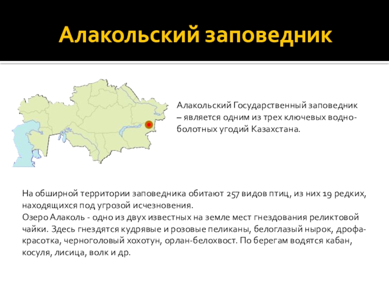 Озеро Алаколь - одно из двух известных на земле мест гнездования реликтовой чайки. Здесь гнездятся кудрявые и розовые пеликаны, белоглазый нырок, дрофа-красотка, черноголовый хохотун, орлан-белохвост. По берегам водятся кабан, косуля, лисица, волк и др.