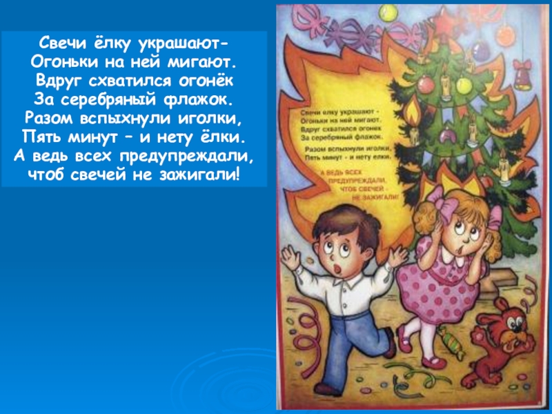 Свечи ёлку украшают-Огоньки на ней мигают.Вдруг схватился огонёк За серебряный флажок.Разом вспыхнули иголки,Пять минут – и нету