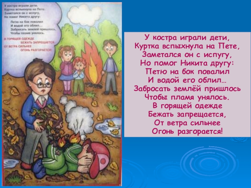 У костра играли дети,Куртка вспыхнула на Пете,Заметался он с испугу,Но помог Никита другу:Петю на бок повалилИ водой