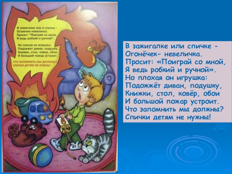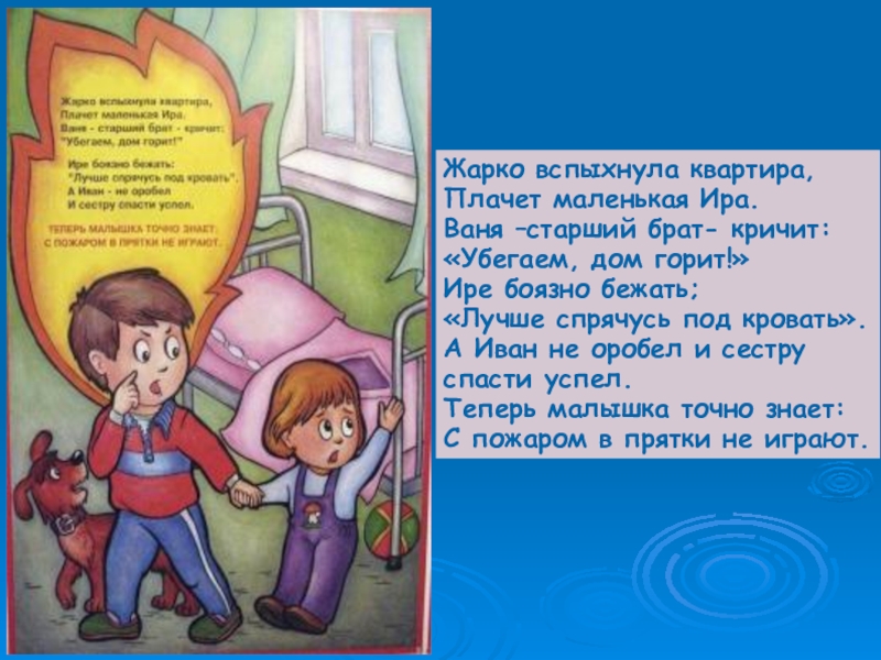 Жарко вспыхнула квартира, Плачет маленькая Ира. Ваня –старший брат- кричит: «Убегаем, дом горит!» Ире боязно бежать; «Лучше