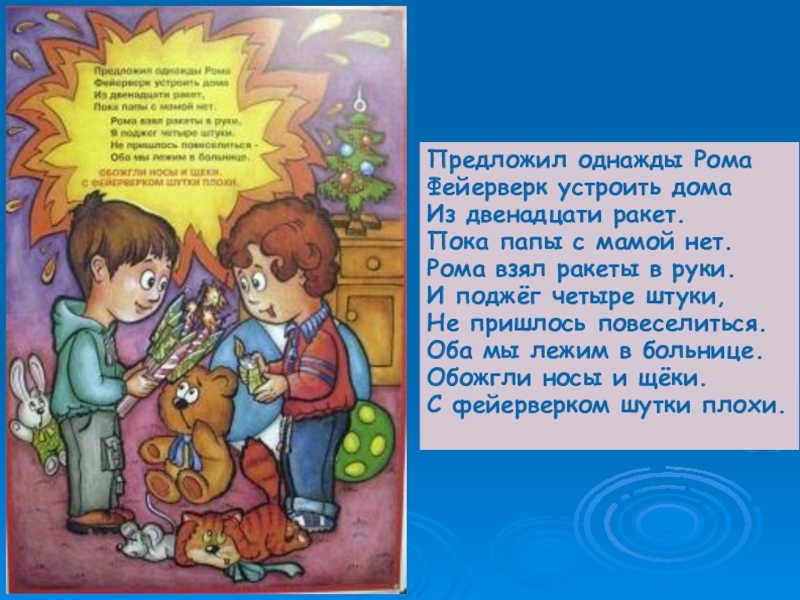 Предложил однажды РомаФейерверк устроить дома Из двенадцати ракет. Пока папы с мамой нет.Рома взял ракеты в руки.И
