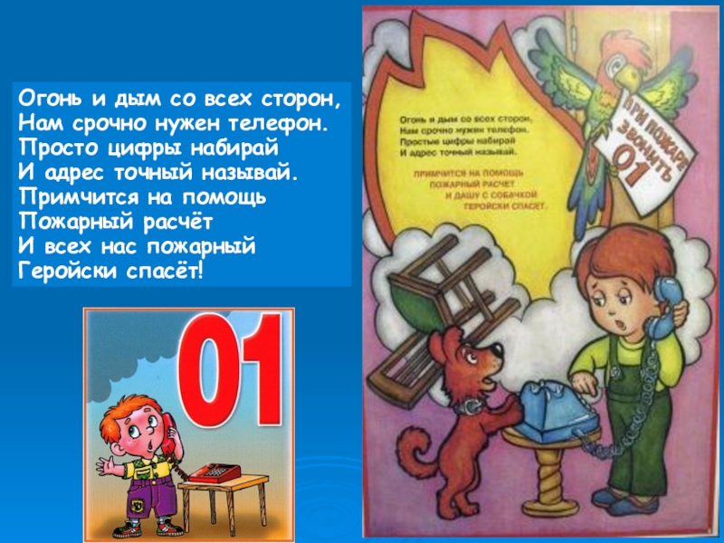 Огонь и дым со всех сторон,Нам срочно нужен телефон.Просто цифры набирайИ адрес точный называй.Примчится на помощь Пожарный