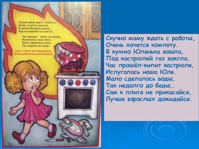 Скучно маму ждать с работы, Очень хочется компоту. В кухню Юленька вошла, Под кастрюлей газ зажгла.Час прошёл–кипит кастрюля, Испугалась наша Юля. Мало сделалось воды, Так недолго до беды… Сам к плите не прикасайся, Лучше взрослых дожидайся.