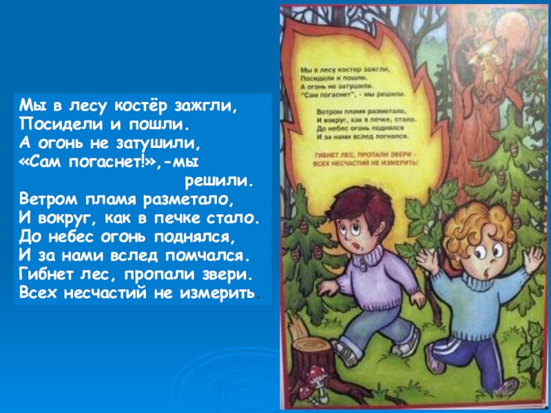 Мы в лесу костёр зажгли,Посидели и пошли.А огонь не затушили,«Сам погаснет!»,-мы
