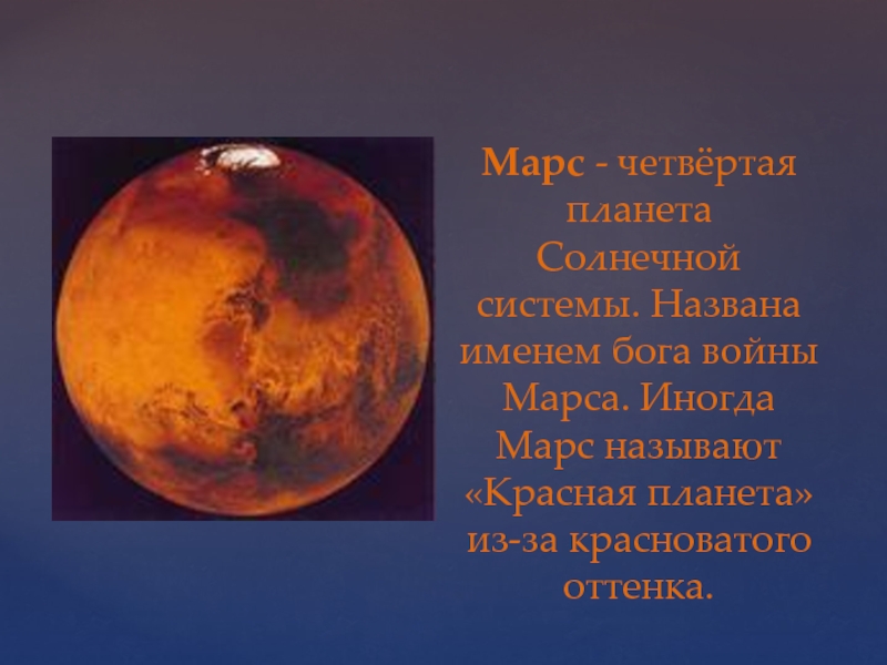 Марс - четвёртая планета Солнечной системы. Названа именем бога войны Марса. Иногда Марс называют «Красная планета» из-за