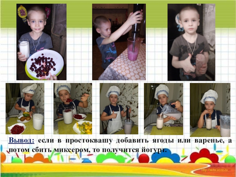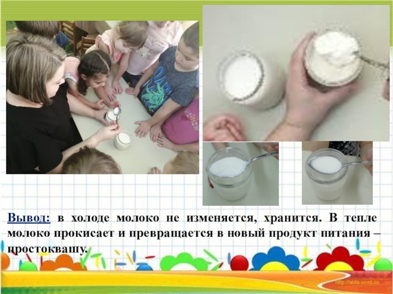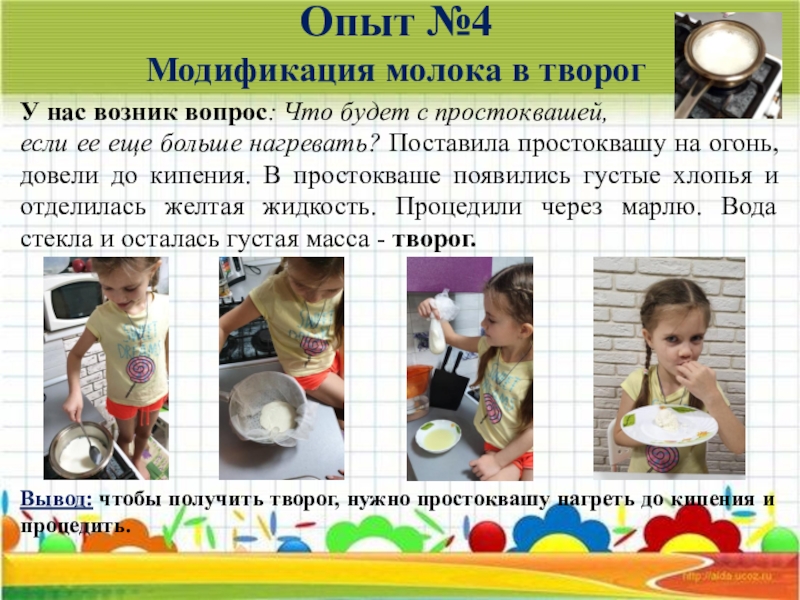 Вывод: чтобы получить творог, нужно простоквашу нагреть до кипения и процедить.