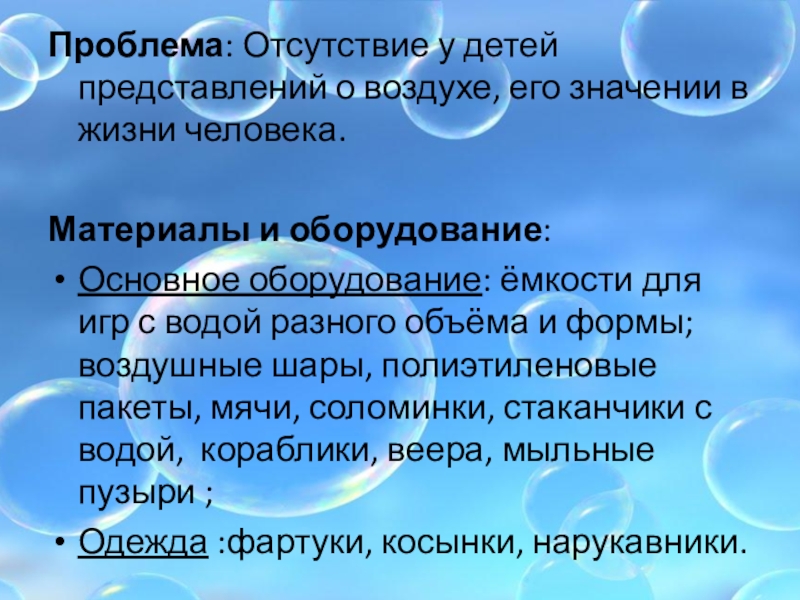 Проблема: Отсутствие у детей представлений о воздухе, его значении в жизни человека.Материалы и оборудование:Основное оборудование: ёмкости для