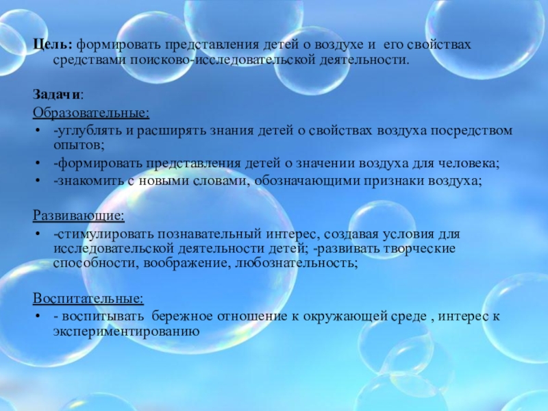 Цель: формировать представления детей о воздухе и его свойствах средствами поисково-исследовательской деятельности.Задачи:Образовательные: -углублять и расширять знания детей