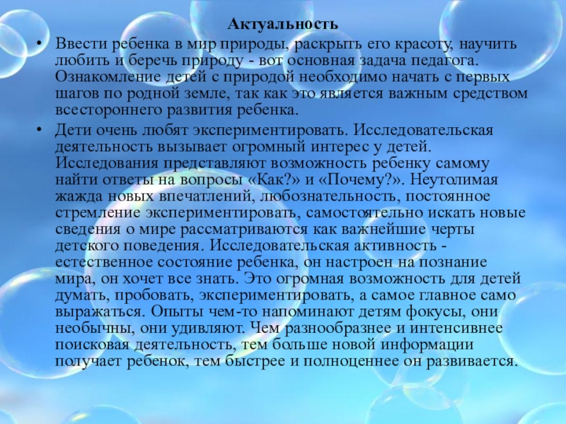 АктуальностьВвести ребенка в мир природы, раскрыть его красоту, научить любить и беречь природу - вот основная задача