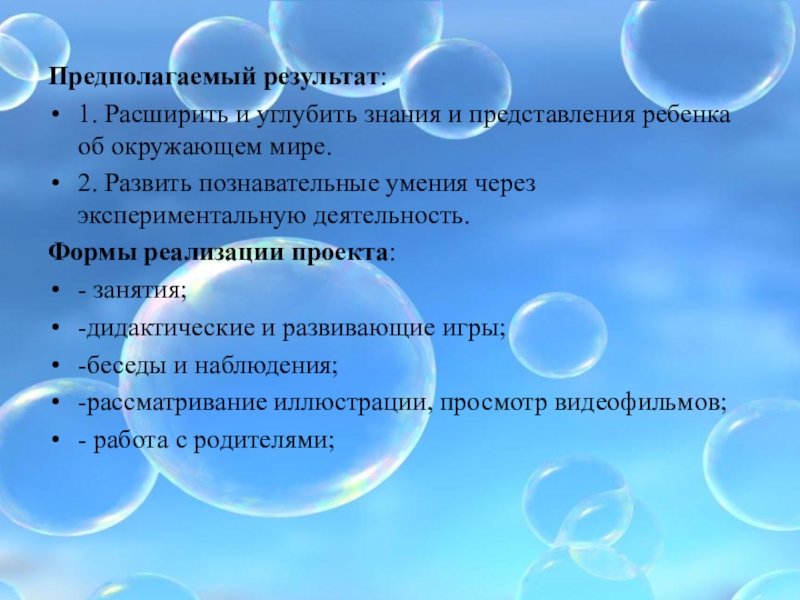 Предполагаемый результат:1. Расширить и углубить знания и представления ребенка об окружающем мире.2. Развить познавательные умения через экспериментальную