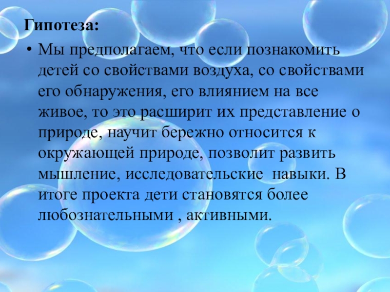 Гипотеза:Мы предполагаем, что если познакомить детей со свойствами воздуха, со свойствами его обнаружения, его влиянием на все