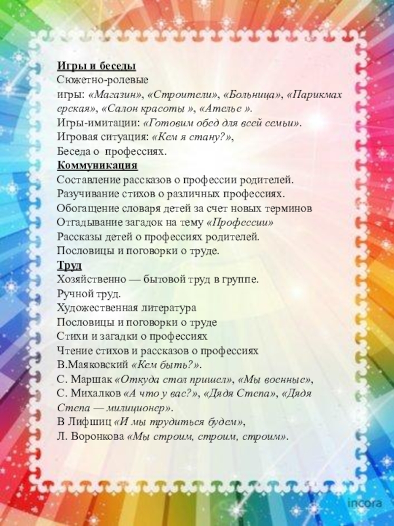 Дидактические игры: «Подскажи словечко», «Угадай кто это?», «Магазин игрушек», «Кто больше расскажет о профессии!», «Угадайте, что я делаю?», «Что сначала, что потом?», «Где можно это купить?», «Назови профессию», «Что кому», «Угадай профессию».
