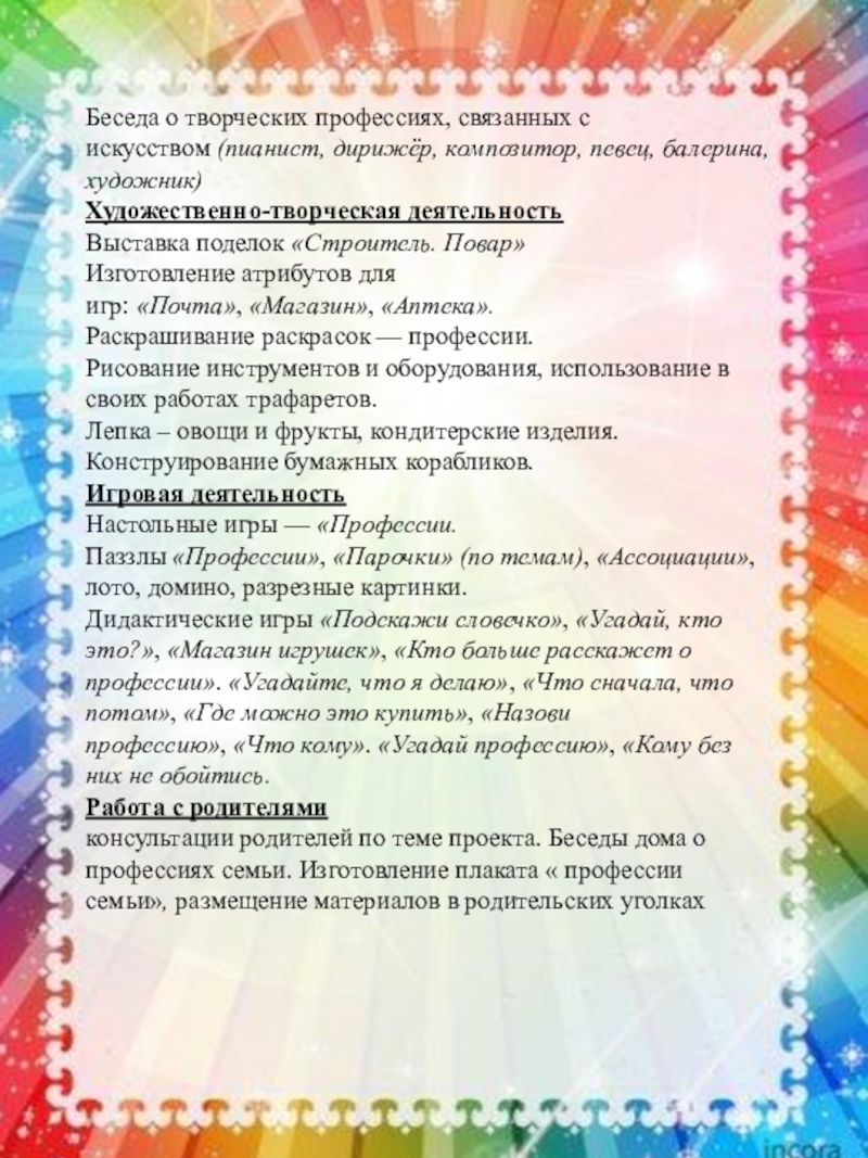 консультации родителей по теме проекта. Беседы дома о профессиях семьи. Изготовление плаката « профессии семьи», размещение материалов в родительских уголках