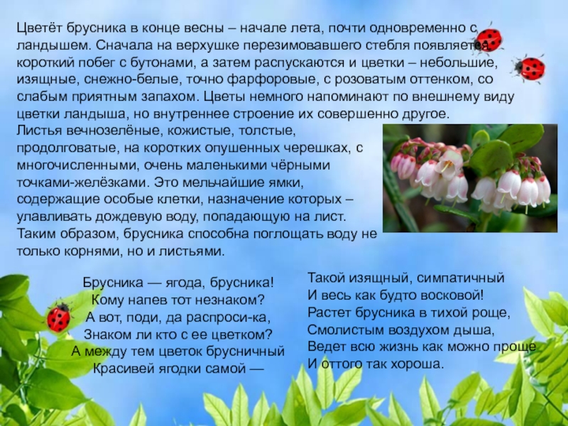 Цветёт брусника в конце весны – начале лета, почти одновременно с ландышем. Сначала на верхушке перезимовавшего стебля появляется короткий побег с бутонами, а затем распускаются и цветки – небольшие, изящные, снежно-белые, точно фарфоровые, с розоватым оттенком, со слабым приятным запахом. Цветы немного напоминают по внешнему виду цветки ландыша, но внутреннее строение их совершенно другое.