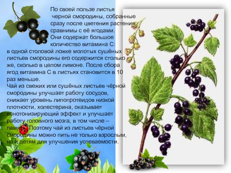 в одной столовой ложке молотых сушёных листьев смородины его содержится столько же, сколько в целом лимоне. После сбора ягод витамина С в листьях становится в 10 раз меньше.