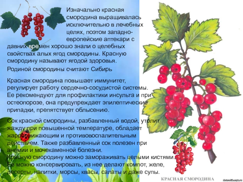 давних времен хорошо знали о целебных свойствах алых ягод смородины. Красную смородину называют ягодой здоровья.