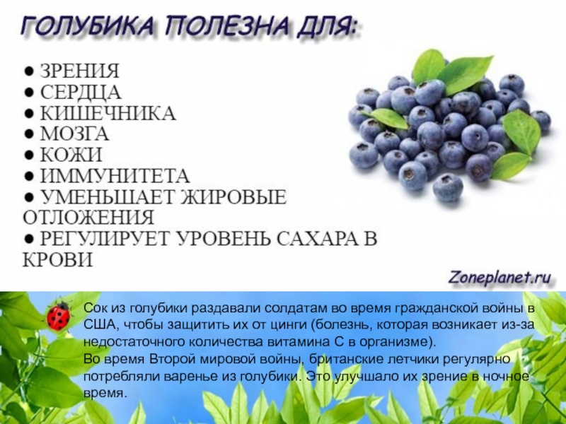 * Во времена Второй мировой войны английские летчики ежедневно ели свежую чернику и варенье из этих ягод. Они делали это для того, чтобы их глаза могли лучше видеть в темное время суток.