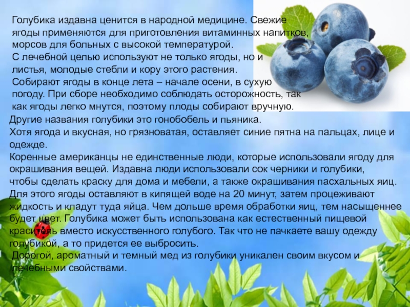 Голубика издавна ценится в народной медицине. Свежие ягоды применяются для приготовления витаминных напитков, морсов для больных с высокой температурой.